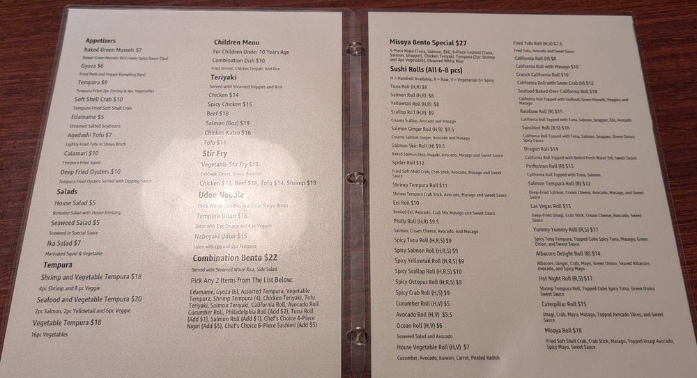 Introducing the menu at Sushi Misoya - Temp. CLOSED, where you can find a variety of house special rolls including the delicious Sunshine Roll, Yummy Yummy Roll, Caterpillar Roll, Rainbow Roll, Misoya Roll, and Perfection Roll. For those looking for sushi combinations, options like Sushi Combination A and Sushi & Sashimi are available. Customers rave about the fresh fish, sweet crab, and delectable avocado used in their dishes. With reviews highlighting the cozy atmosphere, friendly service, and hidden gem status, Sushi Misoya is praised for its traditional Japanese flavors and authentic dishes. Don't miss out on their authentic Miso soup and Chicken Yakisoba for a truly satisfying dining experience. Overall, Sushi Misoya offers a straightforward menu with fresh and perfectly balanced sushi, making it a must-visit for sushi lovers in Lynnwood.
